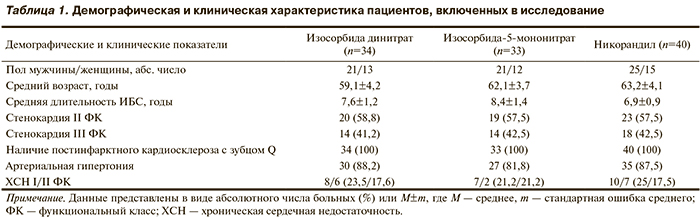 Группы больных, получавших дополнительно к базисной терапии изосорбида динитрат, изосорбида-5-мононитрат или никорандил, были сопоставимы по полу, возрасту, ФК стенокардии, длительности заболевания (табл. 1). Длительность наблюдения составила 24 нед.