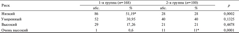 Итак, по результатам первичной оценки риска развития ССО достоверно больше пациентов с низким риском было в 1-й группе, а с очень высоким во 2-й группе, по умеренному и высокому рискам развития ССО группы не различались.