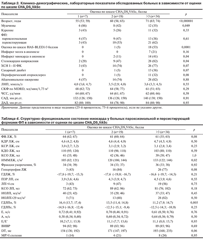 При анализе параметров ЭхоКГ не наблюдалось пропорционального с ростом оценки по шкале CHA2DS2VASc увеличения размера и объема ЛП, как и ИОЛП (табл. 4).