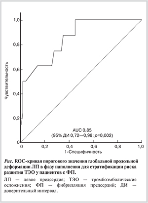 Таким образом, более тяжелое течение рецидивирующей фибрилляции предсердий ассоциируется с более выраженными структурно-функциональными изменениями левого предсердия. Наряду с этим нормальные линейные размеры левого предсердия не исключают его структурного ремоделирования, более точной оценкой которого является индекс объема левого предсердия. Cнижение глобальной деформации левого предсердия в фазу наполнения служит независимым предиктором повышения индекса риска тромбоэмболических осложнений. При этом полученное в ходе ROC-анализа эффективное пороговое значение глобальной деформации левого предсердия, равное 16,7%, позволяет разграничить пациентов с умеренным и высоким риском развития тромбоэмболических осложнений, что может иметь практическое значение для выбора тактики назначения пероральных антикоагулянтов у больных с оценкой по шкале CHA2DS2VASc 1 балл и пациентов с высоким риском кровотечений.