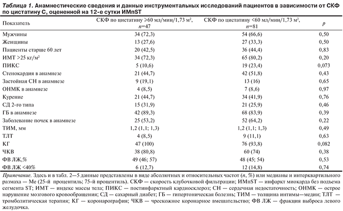 Расчет скорости клубочковой фильтрации (СКФ) выполнен несколькими способами: по формуле MDRD [6] — с учетом уровня креатинина в сыворотке крови, оцененного на 1-е и 12-е сутки ИМпST, по уровню цистатина С, оцененного на 12-е сутки, по формуле Hoek — СКФ [мл/мин/1,73 м2]=(80,35/цистатин C [мг/л]) — 4,3 [7]. Кроме того, определен клиренс креатинина по формуле Кокрофта—Гаулта, мл/мин [8]. Больных с СКФ по цистатину С, оцененному на 12-е сутки ИМпST, менее 60 мл/мин/1,73 м2 было 81 (63,28%).