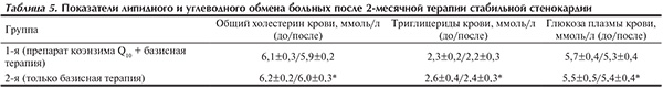 Безопасным профилем лечения сердечно-сосудистых больных считается отсутствие негативного влияния на липидный и углеводный обмен, а также клинически значимых побочных эффектов. Обусловивших необходимость отмены препарата клинически значимых побочных эффектов не было ни в одном случае. В 2 случаях у больных, получавших препарат коэнзима Q10, отмечались эпизоды тошноты, самостоятельно купировавшиеся и не требовавшие медикаментозного вмешательства (у одного больного была язвенная болезнь желудка в анамнезе). Ни один из показателей липидного и углеводного обмена статистически достоверно не изменился, хотя есть определенные тенденции к нормализации (табл. 5). Поэтому можно констатировать, что препарат коэнзима Q10 не оказывает нежелательное воздействие на основные метаболические показатели липидного и углеводного обмена.