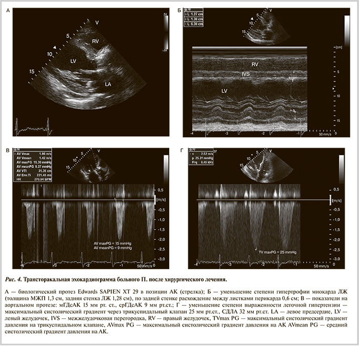 После хирургического вмешательства отмечено улучшение состояния больного: снижение ЧСС до 68—72 уд/мин, увеличение АД до 110—120/60 мм рт.ст., отсутствие одышки в покое и снижение давления в легочной артерии до 42/24 мм рт.ст. Успешное проведение малотравматичной операции без использования аппарата искусственного кровообращения позволило активизировать больного в течение 3 сут после операции. При повторном суточном мониторировании ЭКГ клинически значимых нарушений ритма и проводимости сердца не зарегистрировано. При ЭхоКГ на 3-и сутки после ТПАК (рис. 4) дисфункции аортального протеза не наблюдалось, уменьшились признаки легочной гипертензии и количество жидкости в полости перикарда.