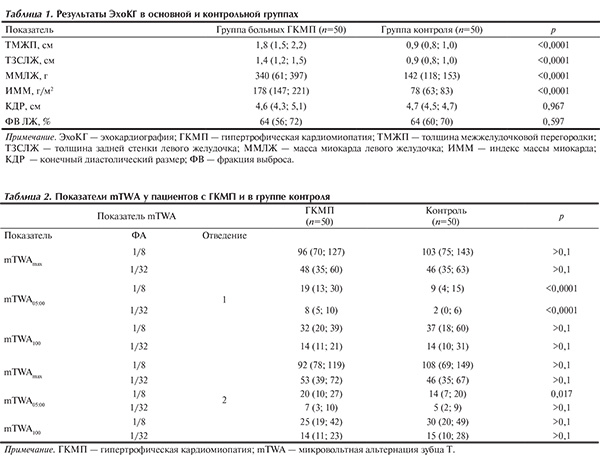 При анализе показателей mTWA обнаружено, что больные ГКМП характеризовались достоверно более высокими значениями mTWA05:00 (при ФА 1/8 и 1/32 в первом мониторном отведении и при ФА 1/8 во втором отведении) по сравнению с группой контроля (табл. 2).