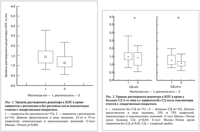 Уровень растворимого рецептора к КПГ в крови больных, у которых развился рестеноз после имплантации стентов, покрытых лекарственным препаратом, оказался значительно ниже, чем в крови пациентов без рестеноза (рис. 1).