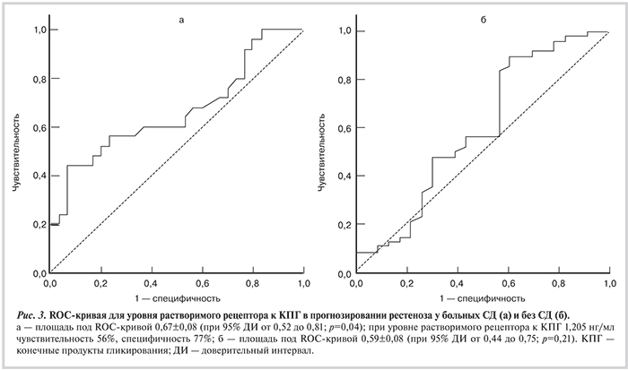 Согласно результатам ROC-анализа, при равной точке отсечения уровня растворимого рецептора к КПГ 1205 пг/мл у больных СД достигается оптимальное сочетание чувствительности и специфичности: 56 и 77% соответственно (рис. 3, а). ROC-анализ не подтвердил диагностическую ценность уровня растворимого рецептора к КПГ как фактора риска рестеноза у пациентов без СД (рис. 3, б). Площадь под ROC-кривой 0,59±0,08 (при 95% доверительном интервале — ДИ от 0,44 до 0,75; р=0,21).