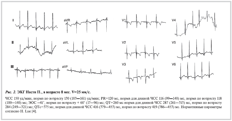 В Центр синкопальных состояний и сердечных аритмий (ЦСССА) у детей и подростков ФМБА России была направлена на обследование Виктория П. в возрасте 11 мес для исключения предполагаемой надпочечниковой недостаточности. Девочка от второй беременности, срочных родов кесаревым сечением. Первая беременность и роды закончилась рождением 2 девочек, разнояйцевых близнецов, которые внезапно умерли в возрасте 4 и 5 лет. Масса тела Виктории при рождении 4750 г, рост 58 см. Оценка по шкале Апгар 8—9 баллов. Период новорожденности протекал без особенностей. До 8 мес жизни трижды возникали приступы бледности, вялости. Первый приступ — в возрасте 2 мес, на фоне ОРВИ, при нормальной температуре тела возникла внезапная вялость, выступил холодный пот, сознание не теряла. Второй приступ возник в возрасте 7 мес. На фоне приема гидрокортизона и течения ОРВИ с лихорадкой 39 °С, во сне, возникли одышка, тахикардия, бледность кожных покровов. Для уточнения природы пароксизмов девочка была консультирована кардиологами в нескольких клиниках и институтах Москвы. Обобщенное заключение: «Данных, подтверждающих структурные и органические заболевания сердца, не выявлены, отмечена умеренная брадикардия. Данных за синдром удлиненного интервала QT нет. В специализированном кардиологическом лечении не нуждается». В связи с неясной природой симптоматики, смертью сестер Виктории П. рекомендовали консультацию в ЦСССА ФМБА России для уточнения диагноза и исключения аритмогенного характера пароксизмов.