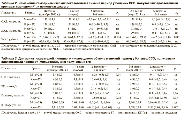 Влияние мельдония на гемодинамические показатели. В табл. 2 представлено изменение гемодинамических показателей в сравниваемых группах в ходе исследования. В группе М отмечается снижение частоты сердечных сокращений (ЧСС) на 1-м визите, сохраняющееся весь зимний период. Колебания АД в обеих группах были статистически незначимы.