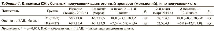 Влияние мельдония на КЖ больных. Прием мельдония ассоциировался с повышением КЖ, что отразилось увеличением оценки по ВАШ как на 1-м, так и на 2-м визитах; в группе К динамика была отрицательной: Δ +10,0 балла в группе М против –7,5 балла в группе К в мороз (р=0,04) и Δ +10,0 балла против —5,0 балла соответственно в марте 2014 г. (р=0,055) (табл. 4).