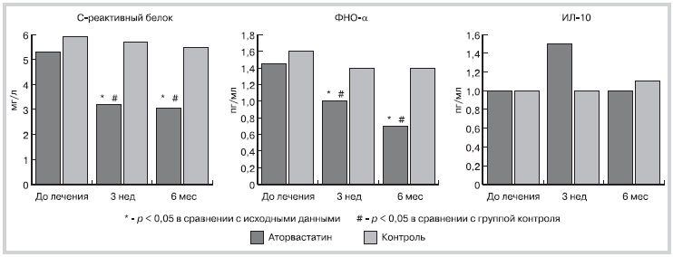 Данный эффект был стойким и сохранялся в течение 6-месячной терапии, в то время как в контрольной группе уровень СРБ снижался незначимо. Благоприятное действие аторвастатина на степень иммунного воспаления подтверждается достоверным снижением уровня ФНО-α к 3-й неделе терапии. Продолжение лечения аторвастатином в течение 6 мес сопровождалось дальнейшим уменьшением уровня ФНО-α. В контрольной группе уменьшение уровня ФНО-α было достоверным. При оценке динамики уровня противовоспалительного ИЛ-10 отмечено его повышение в группе аторвастатина к 3-й неделе лечения, которое, впрочем, не достигло значимого уровня. К окончанию 6-месячной терапии аторвастатином уровень ИЛ-10 вернулся к исходному и по этому показателю группы не различались.