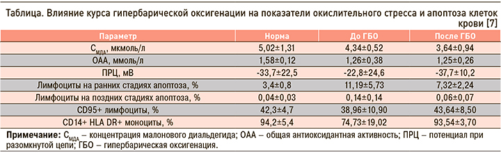 Кроме того, проведение курса ГБО приводило к нормализации процессов апоптоза: это выражалось в умеренном снижении клеток на ранних стадиях апоптотической гибели, восстановлении способности моноцитов экспрессировать на поверхности HLA-DR, нормализации СD95+ лимфоцитов (см. табл.).